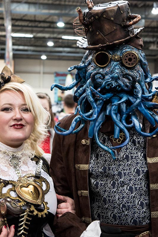 Egal, wir enterten die Hallen und eilten erst einmal zu jemandem, den wir treffen wollten. Mein Mann hatte sich für den Comic STEAM NOIR von Felix Mertikat als Mitglied des Kalendarischen Ordens »verkleidet«, und wir waren gespannt, wie es dem Künstler gefallen würde. Urteilt selbst: