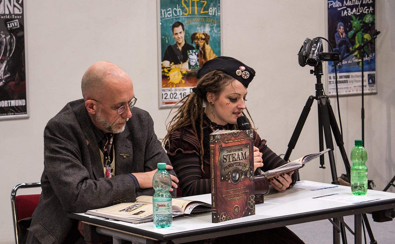 Bis jetzt hab ich ziemlich viel gemotzt, ich weiß, aber mir hat das alles nicht gefallen. Was mir dann gefallen hat, war die Lesung aus dem STEAMPANOPTIKUM von Clara Lina Wirz und Alex Jahnke. Ich bin direkt sitzen geblieben und habe Felix Mertikat und Verena Klinke gelauscht.